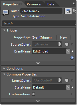 - After the user registers a new attendee we should go back to the default state, we can do this by using the GoToStateAction behavior we used earlier, drag and drop this behavior over the DataForm, change the properties of the behavior by setting the EventName to EditEnded and the StateName to Default